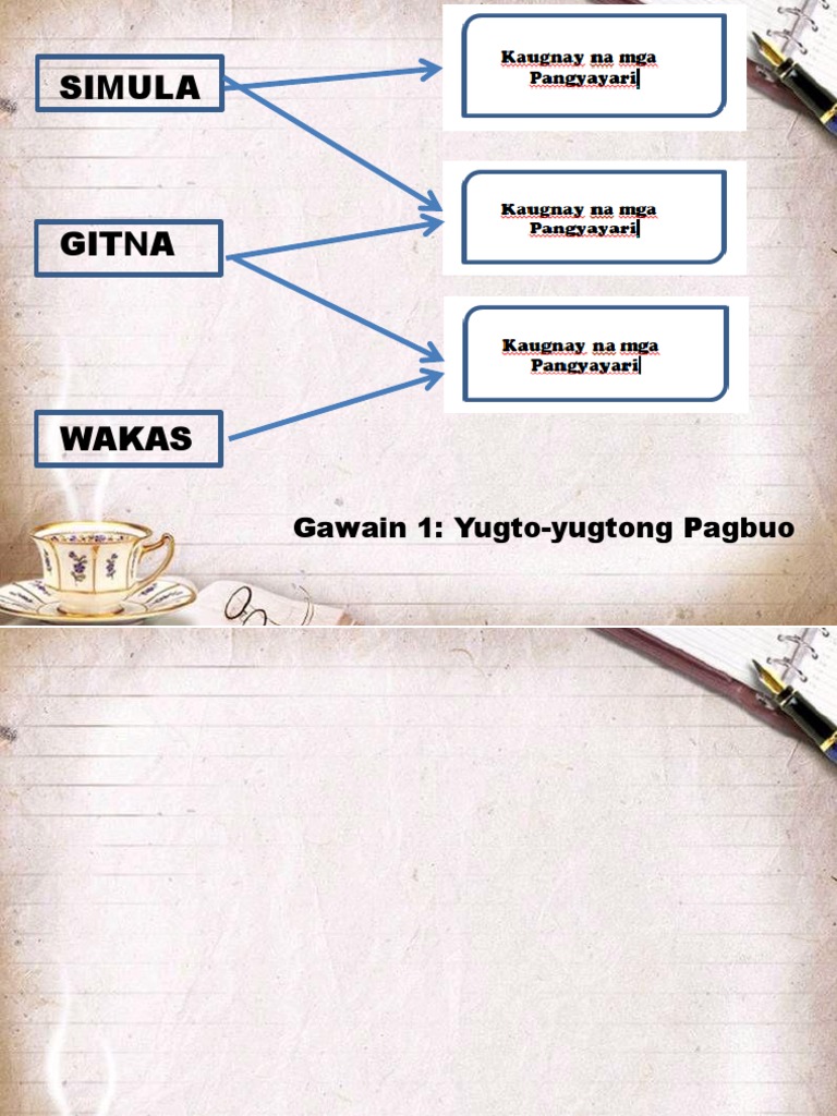 Gawain 01 Gamit ang Graphic Organizer banghayin ang SIMULA- GITNA-WAKAS ng nabasang maikling kuwento galing Tsina na Niyebeng Itim. Gamit ang Graphic Organizer na makikita sa ibaba banghayin ang SIMULA- GITNA-WAKAS ng nabasang maikling kuwento galing Tsinan na Niyebeng Itim. Siya rin mismo ang gumawa nito na ginawa niya hanggang Bagong Taon.