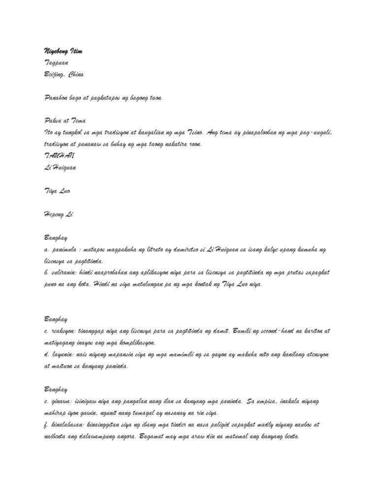 At kahit mayroong kontak ang kaniyang Tiya Luo hindi na. NIYEBENG ITIM Ni Liu Heng Isinalin sa Filipino ni Galileo S. Ito ay tungkol sa mga tradisyon at kaugalian ng mga Tsino.