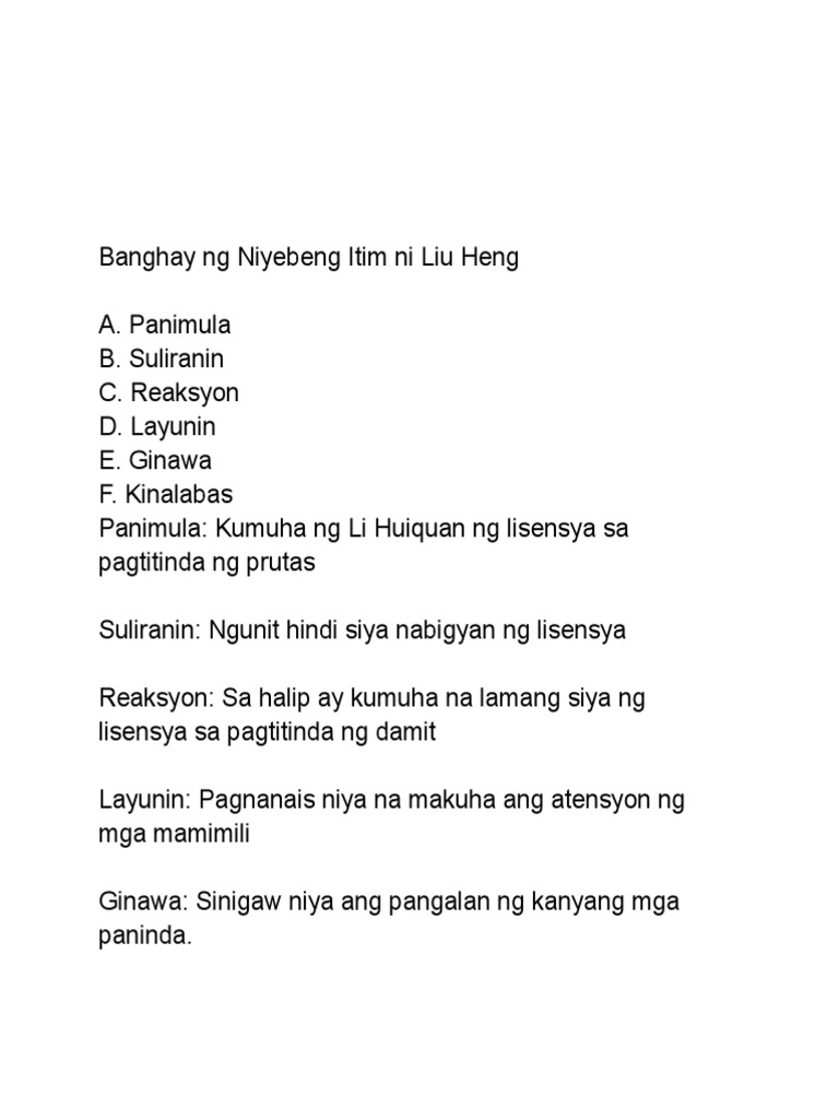 IKALAWANG MARKAHAN ARALIN 24 PanitikanMaikling Kuwento - China TekstoNiyebeng Itim ni Liu Heng salin ni Galileo Zafra WikaMga Pahayag sa Pagsisimula Pagpapadaloy at Pagtatapos ng Isang Kuwento Bilang ng Araw5 Sesyon 89 Ikalawang Markahan 51 BANGHAY ARALIN FILIPINO GRADO 9 MGA KASANAYANG PAMPAGKATUTO SA BAWAT DOMAIN PAG. Matapos makulong sa kulungan ni Li Huiquan ay dumiretso siya sa isang lugar at nagpakuha ng litrato kasama si Tiya louIkalawanagpirmi na siya sa kanyang tahanan upang makapag-isipIkatlopinuntahan niya ang isang kalye upang tignan ang pwesto na ibinigay sa kanya upang makapagsimulang muli sa pagtitinda ng damit at sapatosNoong panahon na. Nagpakuha ng litrato si Li Huiquan sa Red Palace Photo Studio isang bagay na ayaw na ayaw niyang gawin dahil pakiramdam niya.