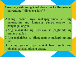 Paano sinika ni Huiquan na malutas ang kanyang suliranin. 2 on a question Kuwento Niyebeng Itim question. Kuwento Niyebeng Itim question.