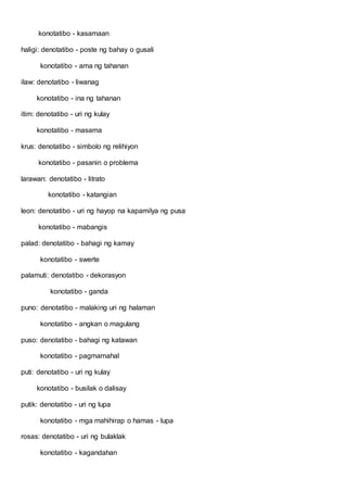 Denotatibo - simbolo ng relihiyon konotatibo - pasanin o problema larawan. Denotatibo - uri ng bulaklak. Likas o literal ang kahulugan ng mga salita.